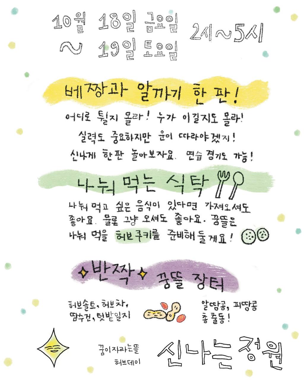 나눠 먹고 싶은 음식이 있다면 가져오셔도 좋아요. 물론 그냥 오셔도 괜찮아요. 꿈뜰은 나눠먹을 허브쿠키를 준비해 놓을게요!