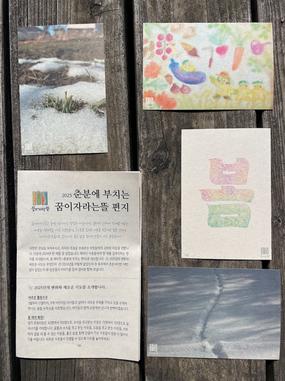 따뜻한 관심과 응원의 메세지는 활동을 지속하는데 아주 큰 힘이 된답니다. 편지를 읽은 소감이나 여러분의 소식을 전해주고 싶으시면 <꿈뜰 일꾼들에게 전하는 메세지>를 남겨주세요. linktr.ee/carefarmer 링크트리에 구글폼으로 창구를 열어두었습니다. 간단하게 문자로 회신해주셔도 좋아요. 동료 일꾼들과 공유하겠습니다.
