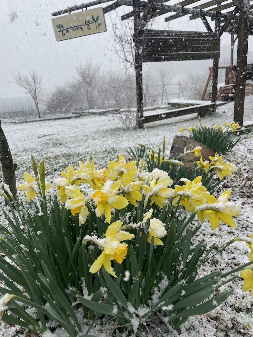 농장 곳곳에 하얀 냉이꽃, 노란 민들레꽃, 자주빛 광대나물꽃, 노란 수선화가 한창입니다. 농장 건너편으론 개나리와 산수유꽃이 보입니다. 농장을 오가는 길에 히야신스와 매화나무 옆을 지나갈 때면 일부러 코를 갖다 대지 않아도 은은한 향기가 풍겨옵니다. 봄의 향기!