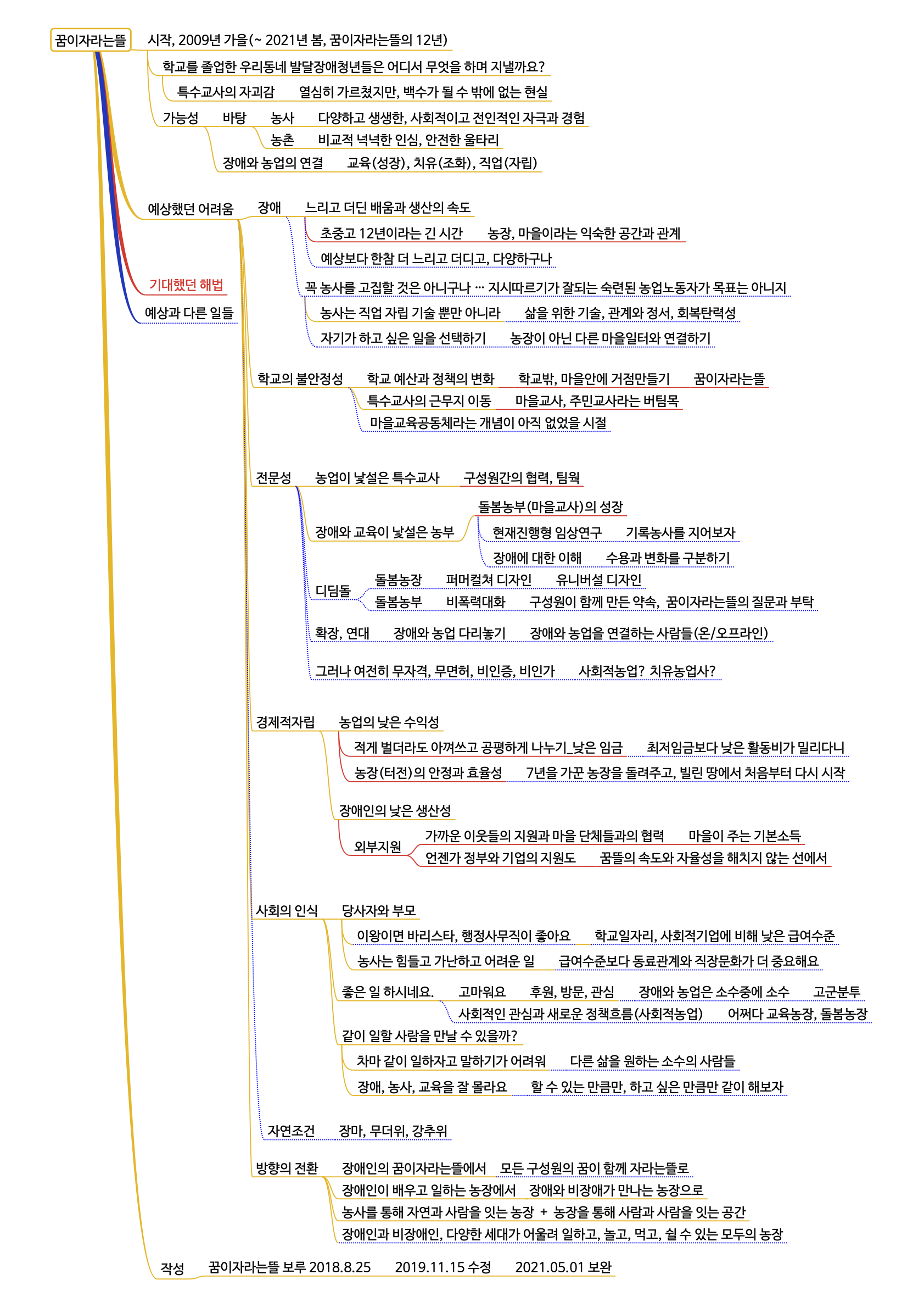꿈이자라는뜰을 시작한 이유, 가능성의 바탕, 예상했던 여러가지 어려움과 기대했던 해법들, 예상 밖의 일들을 한 눈에 볼 수 있도록 한 장으로 정리해 보았습니다. 꿈뜰의 경험을 공유하고 싶어서 만들어 둔 것이지요. 누군가에게 도움이 되기를 바랍니다.