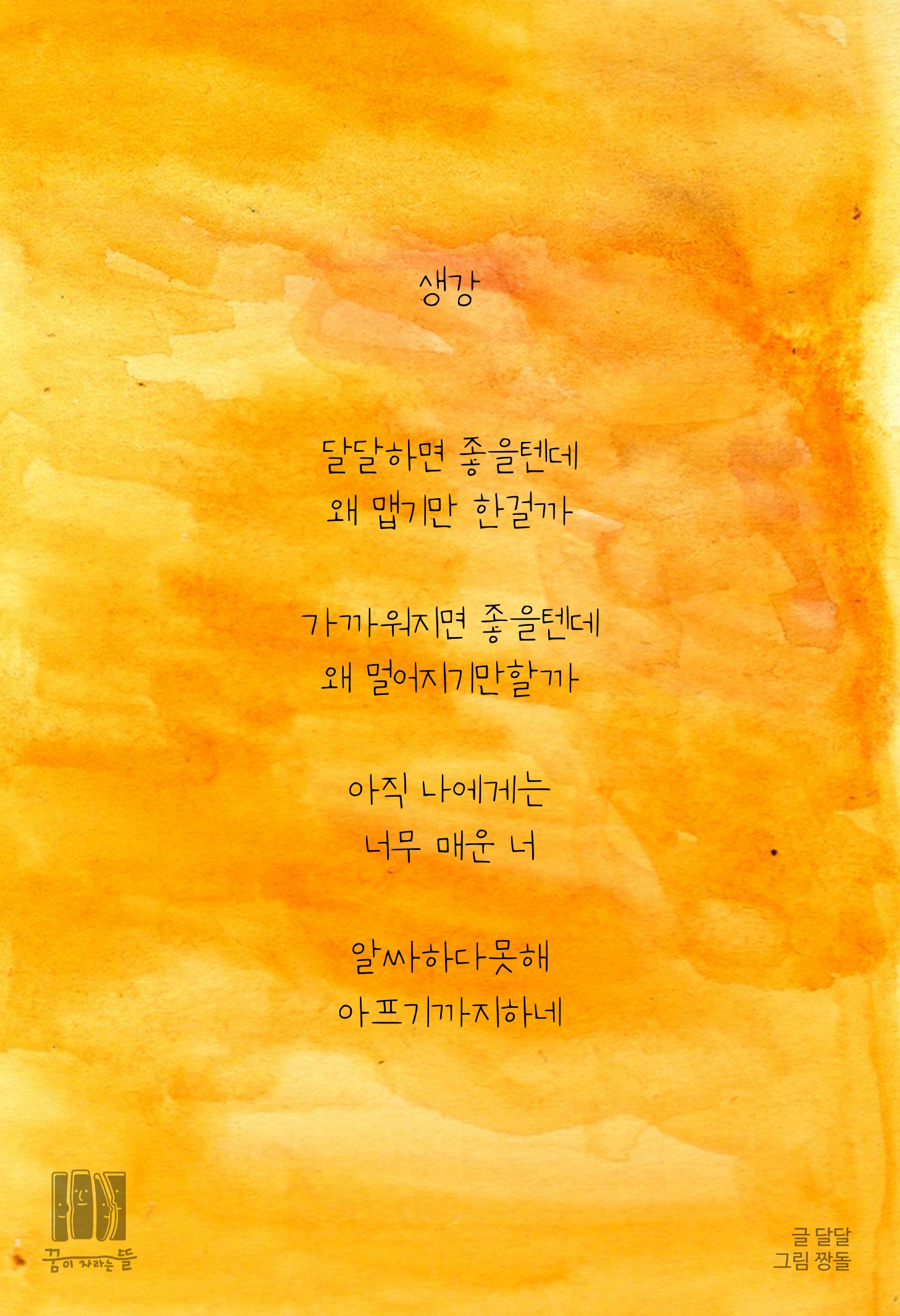 🌕 달달 •생강의 계절이다 보니 생강입니다. 자주 마주하고 다가가고 싶은 무언가를 생각하면서 썼습니다. 생강처럼 알싸하게 즐겨주세요.