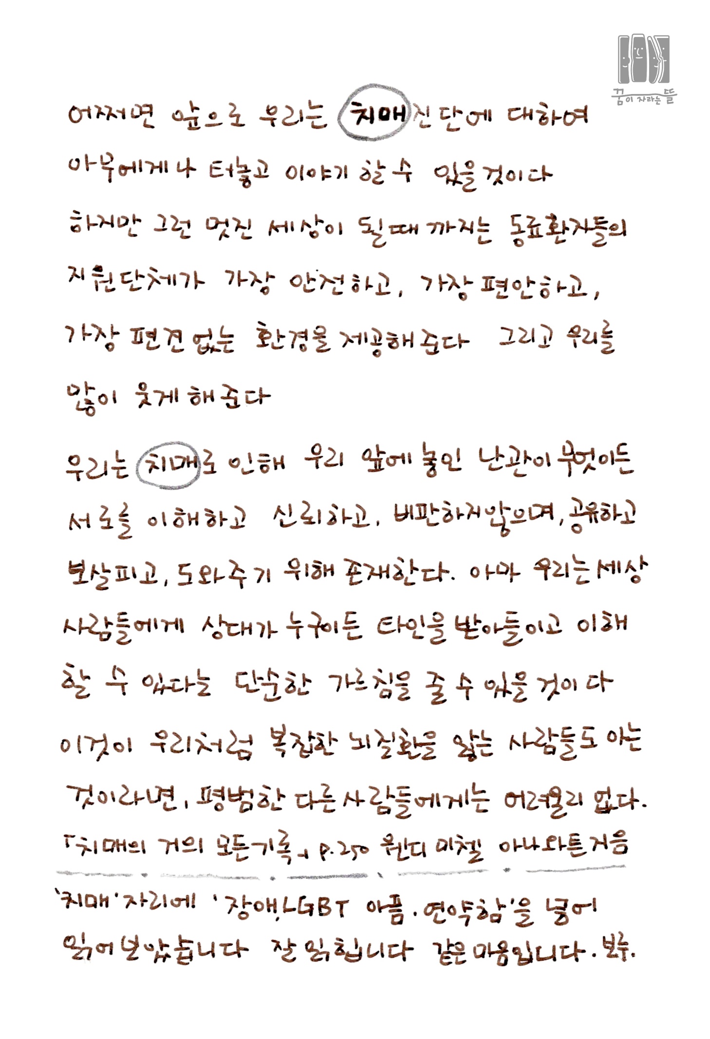『치매의 거의 모든 기록』 책모임 아카이브에 <밑줄그은 문장, 질문과 대답, 회고>를 정리해두었습니다. 아카이브 바로가기▶︎