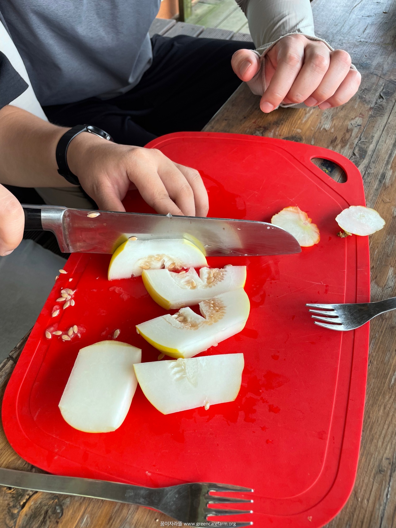 - 올 해 고등부 텃밭에 참외와 복수박이 풍년이었습니다. 덕분에 칼로 잘라 먹는 연습을 실컷 해 봤습니다.