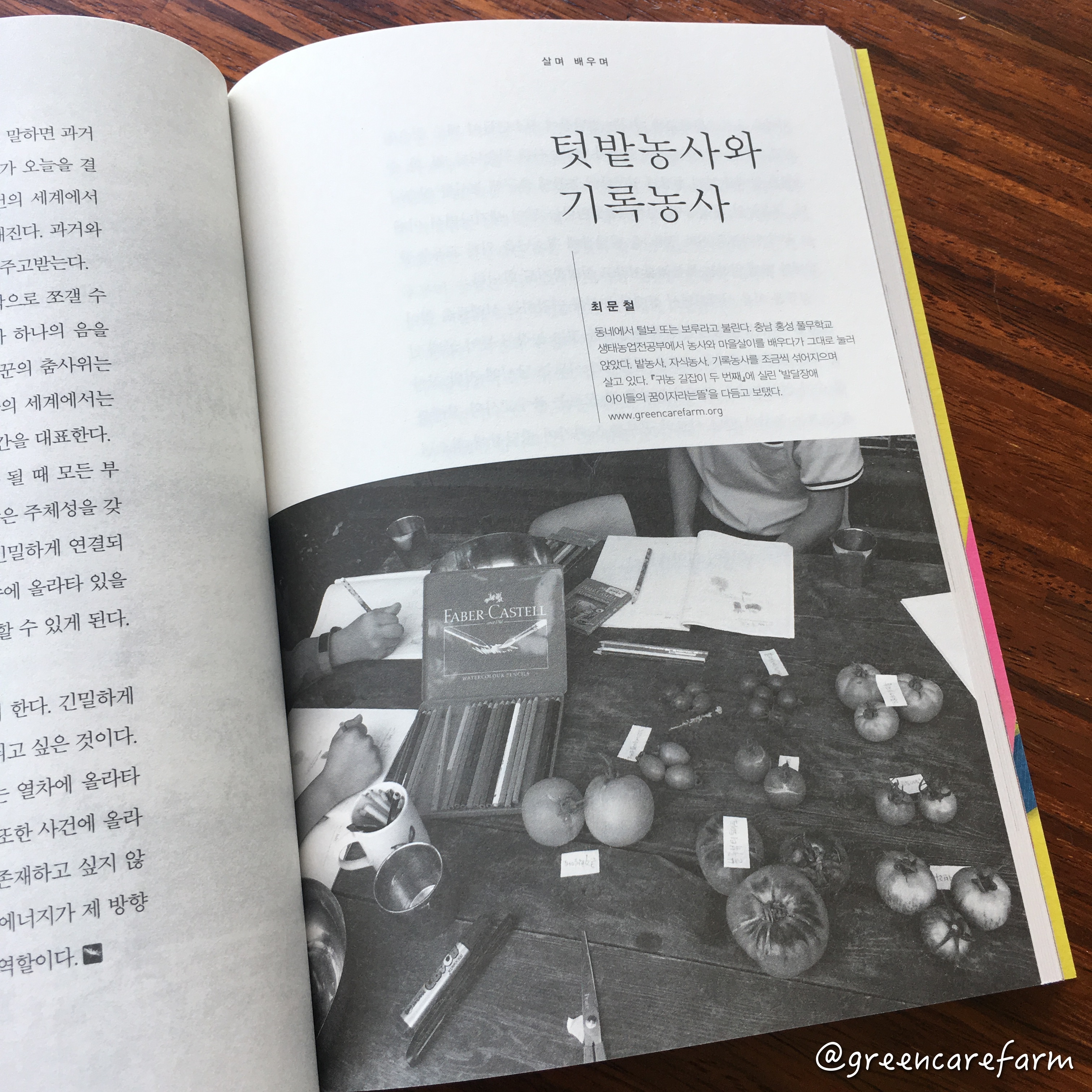 농사를 지으면서 직접 보고, 듣고, 맛보고, 냄새 맡고, 손발을 움직여 해낸 일들을 적어 놓는 것은 또 다른 의미를 갖습니다. 이 기록은‘내년에’ 쓸모 있을 뿐 만 아니라, ‘나에게’ 의미 있는 시간들이 곳곳에 묻어 있기 때문입니다. 텃밭 농사와 함께 기록을 농사지어야 하는 이유입니다.