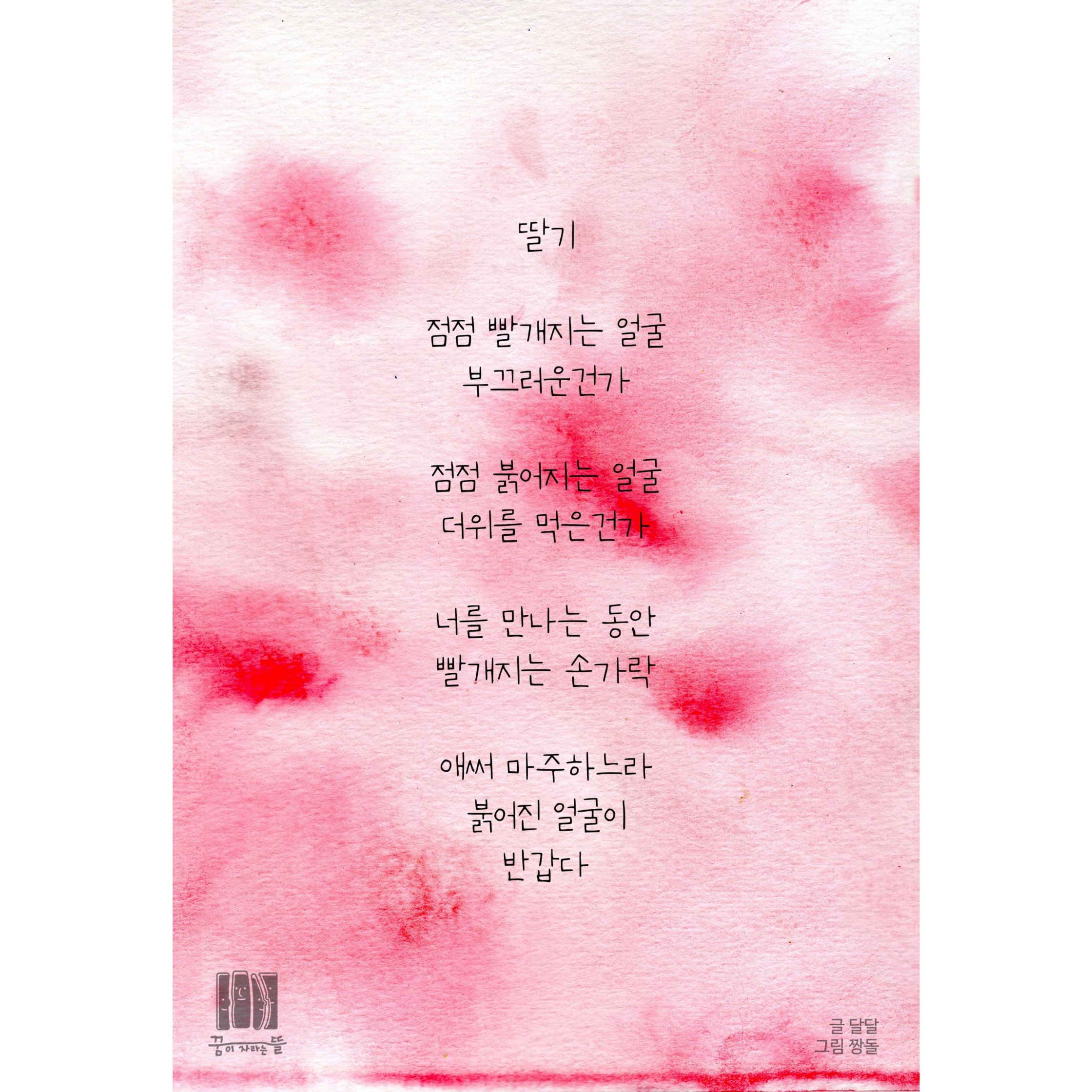🌕 달달 •더워지기 시작할 때, 딸기를 따는 일꾼들의 손과 얼굴을 생각하며 시를 썼습니다. 조금씩 붉어지는 손끝과 얼굴, 새콤한 향, 입 안에 감도는 달콤함을 느낄 수 있으면 좋겠습니다.