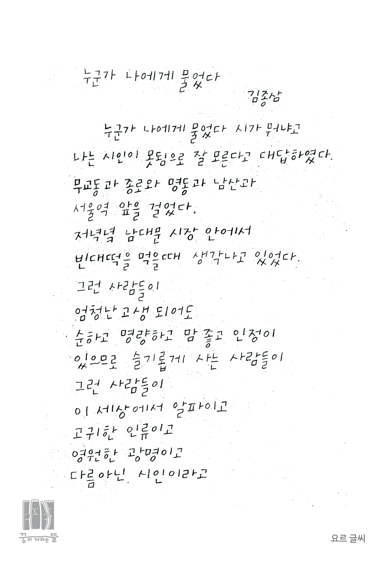 엽서) 질문에 ‘답’을 한다는 건 쉽지 않은 일, 같아요. 시인도 ‘시’가 뭐냐고 묻는 물음에 쉽게 답할 수 없었듯이 농부에게 ‘농사’가 무엇인지… 꿈뜰에게 돌봄과 장애가 무엇인지 물어보면 ‘나’는, ‘우리’는 어떤 ‘답’을 할 수 있을까요?