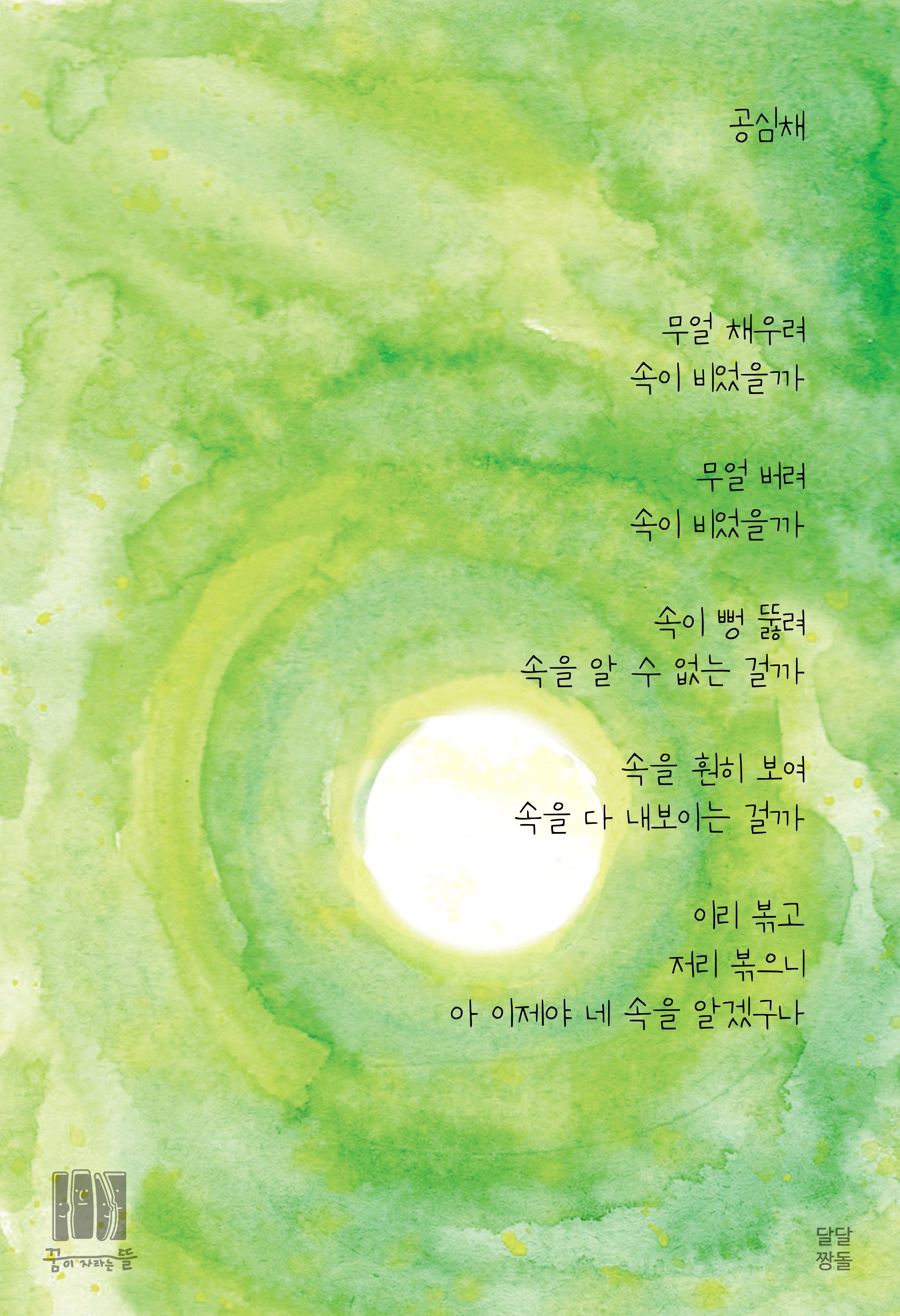 🌕 달달 • ‘공심채는 볶아먹으면 맛있다’는 생각에서 시작된 시에요. 공심채처럼 맛있게 즐겨주세요. 아직 여름이 끝나지 않아 힘드네요. 얼른 여름을 보내고 가을을 맞이하고 싶어요.