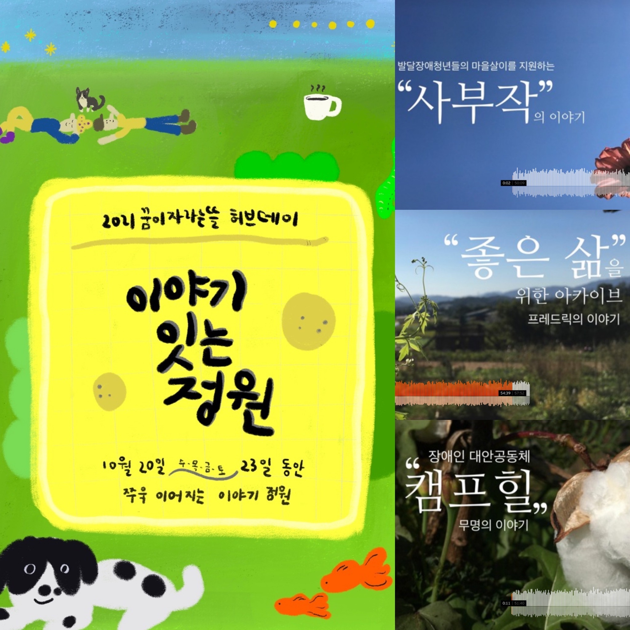 꿈이자라는뜰 허브데이 <이야기잇는정원>에서 나눈 이야기를 공유합니다. 사운드클라우드 플레이리스트 링크를 통해 세 개의 이야기를 연이어 들으실 수 있어요. 각각의 이야기를 따로 듣고 싶으시면, 소개와 함께 올려놓은 플레이어를 이용해주세요. Soundcloud 앱이 없으신 분들도 Listen in browser를 누르시면, 브라우저에서 바로 들으실 수 있습니다.